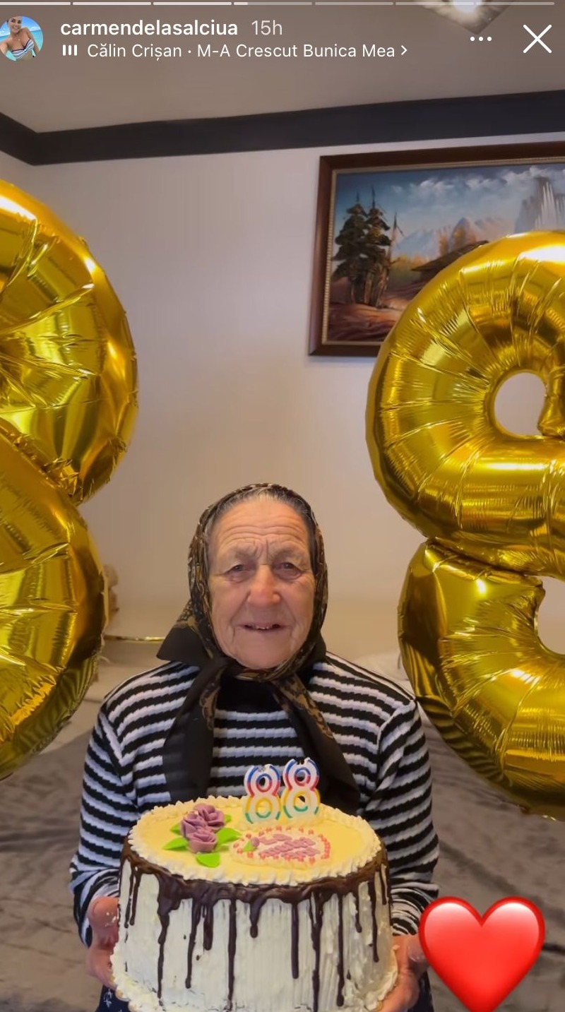 Emoționată și fericită în același timp, Carmen de la Sălciua i-a făcut o urare specială bunicii sale și în mediul online, în văzul fanilor săi. Bunica artistei a fost personajul principal al zilei și, de asemenea, admiratorii solistei s-au grăbit să o felicite pe bătrână, ajunsă la 88 de ani.