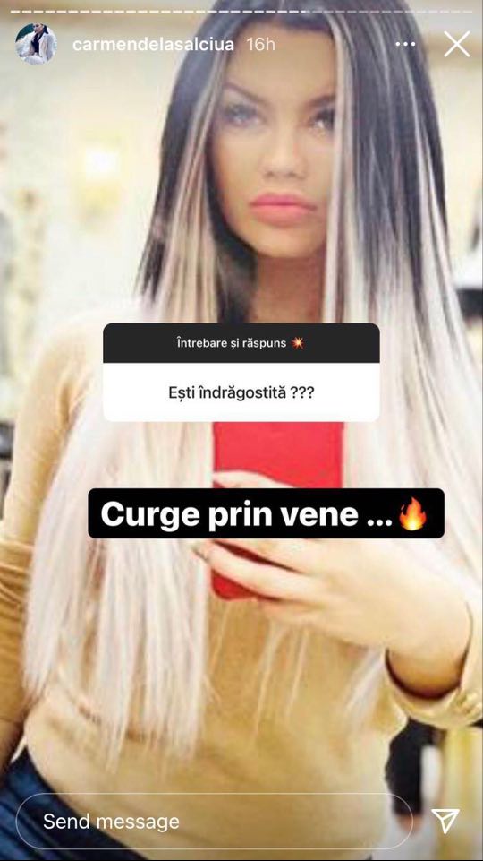 Întrebată de fani dacă este îndrăgostită, Carmen de la Sălciua nu a oferit un răspuns clar, ci a scris „Curge prin vene…”, făcând referire subtilă la piesa „Curge prin vene iubirea ta”, lansată în urmă cu doi ani, la finalul anului 2018. La vremea respectivă, fanii erau siguri că piesa îi este dedicată lui Culiță Sterp, mai ales că, deși erau despărțiri, nu divorțaseră încă.