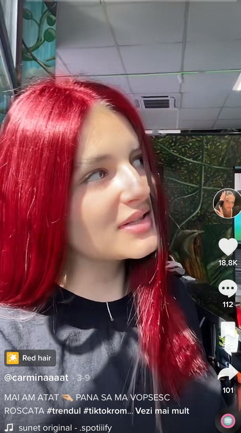 „Mai am atât până să mă vopsesc roșcată.”, a scris Carmina Vârciu în mediul online.