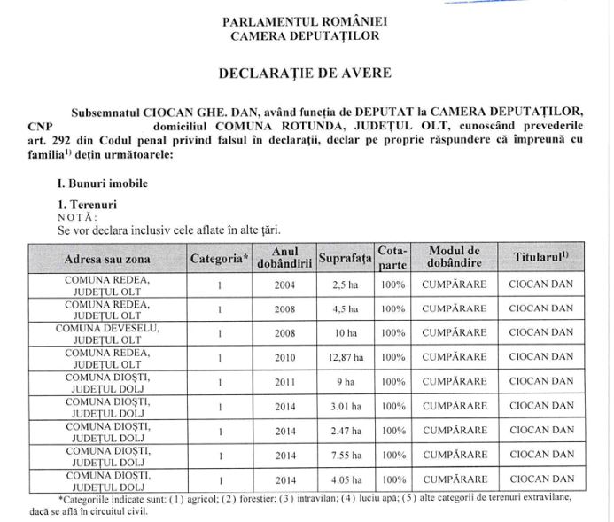 În declarația de avere, Dan Ciocan abia a avut loc să scrie la rubrica terenuri toate proprietățile sale. Culmea, deși este un adevărat moșier, având în proprietate nu mai puțin de 55,95 hectare, împărțite în 9 terenuri în trei comune, dintre care una este Deveselu, Dan Ciocan nu avea, la momentul depunerii declarației, în iunie 2020, o casă pe numele său.