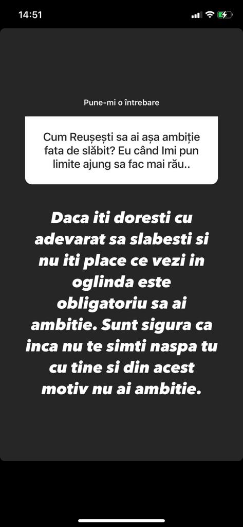 „Cum reușești să ai ambiție față de slăbit? Eu când îmi pun limite ajung să fac mai rău...”, a fost întrebarea fanei pentru Larisa Udilă.