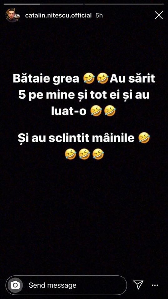 „Bătaie grea. Au sărit 5 pe mine și tot ei și-au luat-o. Și-au scrântit mâinile”, a fost mesajul lui Cătălin, postat pe Instatsory.
