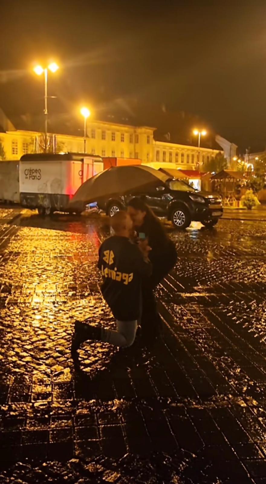 Totul s-a petrecut în centrul Sibiului, iar Alina a fost în culmea fericirii atunci când Cătălin Dobrescu i-a pus inelul pe deget.De asemenea, la cererea în căsătorie au fost prezenți și mai mulți prieteni care au surprins momentul și i-au felicitat pe cei doi îndrăgostiți.