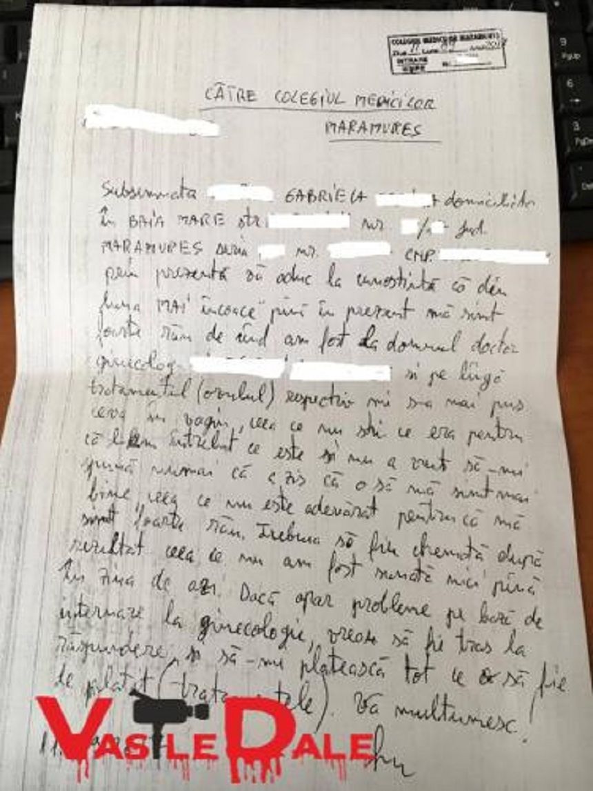 "Subsemnata Gabriela (…) domiciliată în Baia Mare, strada (….), judeţul Maramures, seria (…) nr (…) CNP (….), prin prezenta vă aduc la cunoştinţă că din luna MAI încoace până în prezent mă simt foarte rău de când am fost la domnul doctor ginecolog (…) şi, pe lângă tratamentul (ovulul) respectiv, mi s-a mai pus ceva în vagin, ceea ce nu ştiu ce era, l-am întrebat ce este şi nu a vrut să-mi spună nimic că a zis că o să mă simt mai bine, ceea ce nu este adevărat,