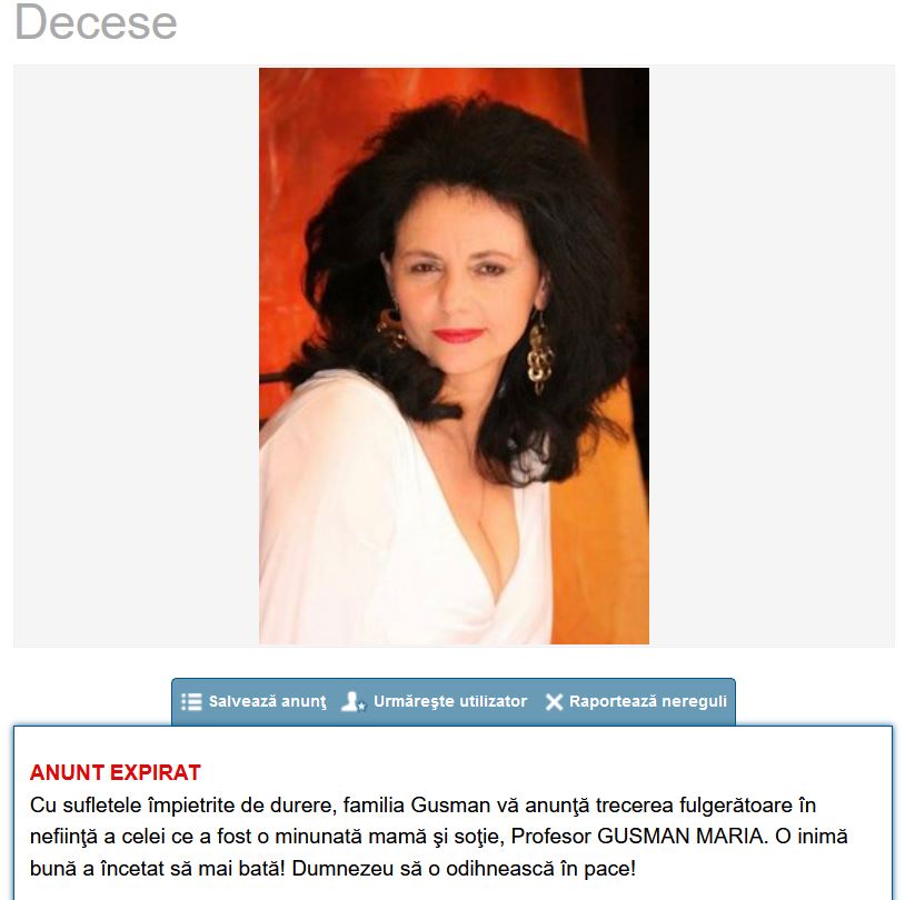 ”Cu sufletele împietrite de durere, familia Gusman vă anunță trecerea fulgerătoare în neființă a celei care a fost o minunată mamă și soție, Profesor Gusman Maria.