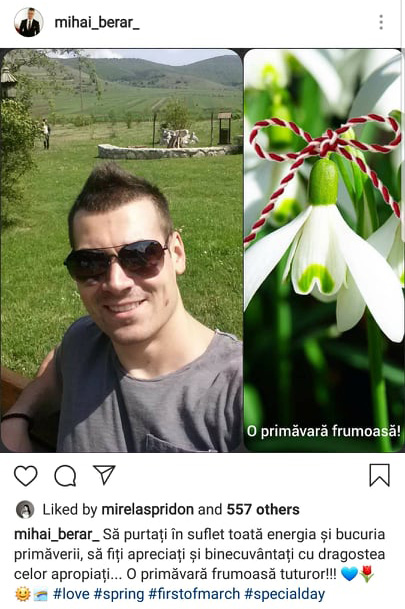 "Să purtaţi în suflet toată energia şi bucuria primăverii, să fiţi apreciaţi şi binecuvântaţi cu dragostea celor apropiaţi. O primăvară frumoasă tuturor", a apărut pe contul de Instagram al lui Mihai Berar, Războinicul din sezonul 3 Exatlon România.