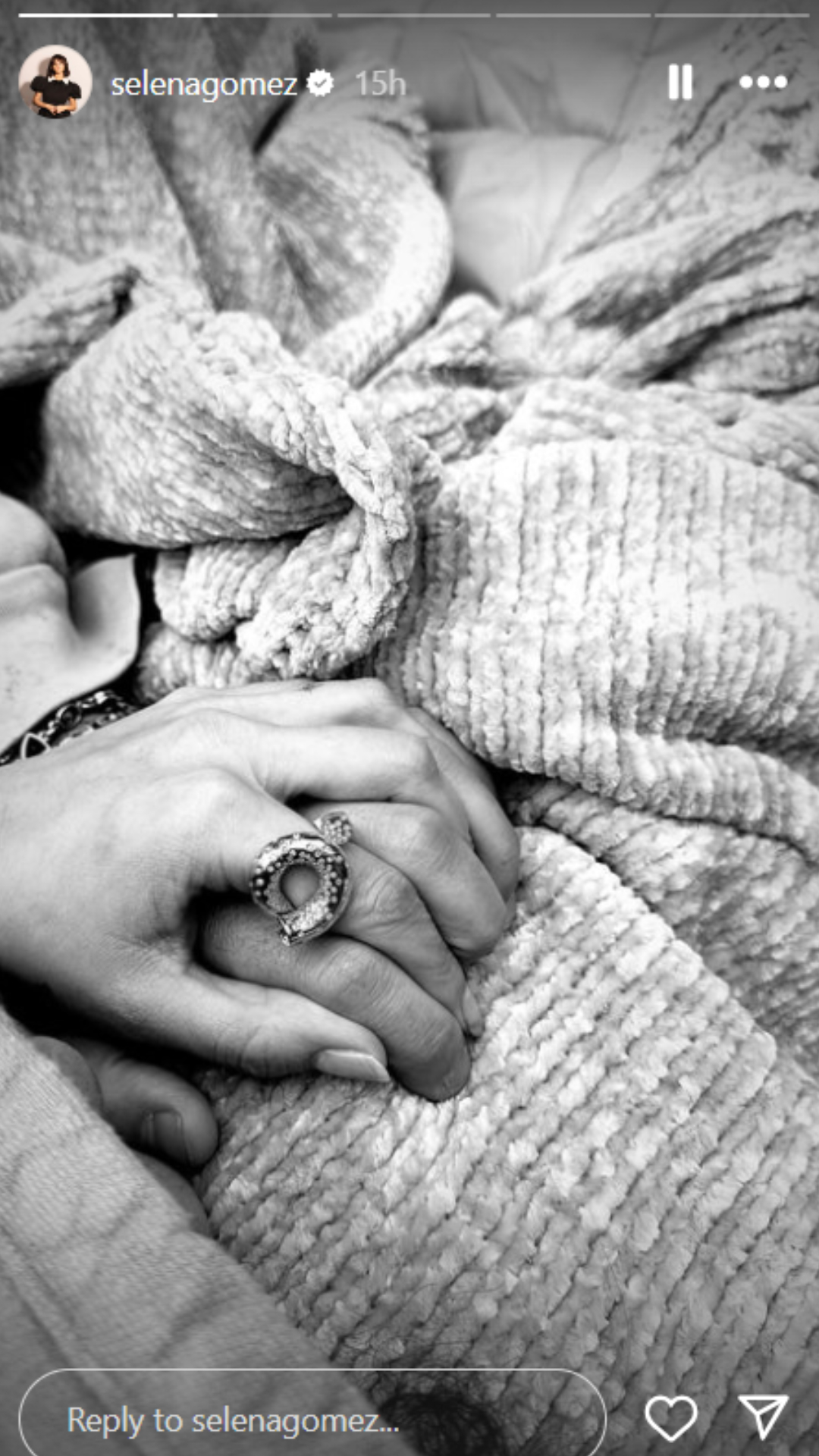 Foarte mulți s-au întrebat și cum a reacționat Selena Gomez la aflarea veștii. Ei bine, la scurt timp după ce Justin a anunțat că va deveni tată, fosta lui parteneră a postat o imagine emoționantă pe contul ei de Instagram, în care a surprins mâna ei și a iubitului său actual.