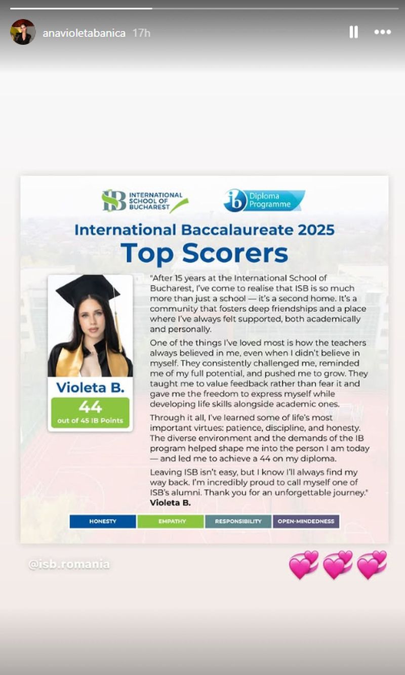 „Mulțumesc, copilul meu bun și muncitor, sunt tare mândra de tine! Azi au venit rezultatele la Bacalaureatul internațional susținut de elevii care au ales acest tip de bacalaureat luna trecută și punctajele finale au fost transmise azi la nivel global. Violeta a obținut cel mai mare scor atins în liceul său, vom afla în curând dacă nu este și cel mai bun rezultat IB la nivel național, 44 puncte din maximul de 45, după susținerea Bacalaureatului Internațional cu probe multiple în limba engleză la: Matematică, Istorie, Biologie, Business, Engleză și Spaniolă. Este deja studentă la drept în SUA la prestigioasa Cornell University, de aceea pentru mine nu mai părea atât de important rezultatul ca nivel de performanță, ea însă și-a dorit să termine cu brio și această etapă și sunt tare recunoscătoare, știind câtă muncă se află în spatele rezultatelor sale”, a mărturisit Andreea Marin pe Facebook.