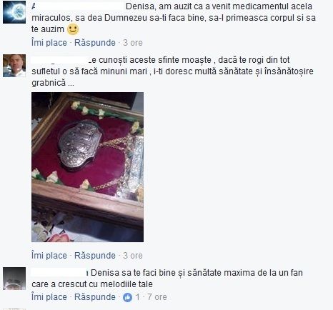 "Daca puteti transmiteti mesajul mamei lui Denisa ca o rog sa incerce sa o duca la Sfantul Arsenie Boca,daca medicii si tratamentele nu dau rezultate puterea Domnului este mare,sa incerce cu orice pret sa ajunga cu ea acolo sau cel putin cu o bluza de a ei sa atinga crucea Sfantului ARSENIE BOCA,inteleg ca in aceste momente mama Denisei este disperata de aceea o rog sa incerce ceea ce am scris mai sus!", "Ai încredere în Dumnezeu şi să vezi că o să te faci bine că Dumnezeu are grija de persoanele cu suflet bun şi fii tare in continuare niciodată să nu îţi pierzi