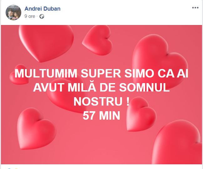 ”Mulțumim super Simo că ai avut milă de somnul nostrul! 57 minute”, este mesajul postat de Andrei Duban târziu în noapte, după meciul Simonei Halep, care a câștigat partida în mai puțin de o oră (Vezi amănunte despre meciul Simonei Halep pe stirilekanald.ro)