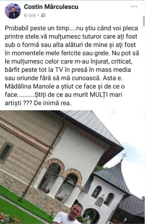 " Probabil peste un timp... nu ştiu când voi pleca printre stele...vă mulţumesc tuturor care aţi fost sub o formă sau alta alături de mine şi aţi fost în momentele mele fericite sau grele. Nu pot să le mulţumesc celor care m-au înjurat, criticat, bârfit peste tot la tv, în presă, în mass media sau oriunde fără să mă cunoască. Asta e. Mădălina Manole a ştiut ce face şi de ce o face..........Ştiţi de ce au murit MULŢI mari artişti??? De inimă rea. ", a scris Costin Mărculescu pe facebook.