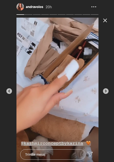 În următorul InstaStory de pe pagina ei, fosta concurentă a show-ului de la Kanal D avea degetul bandajat, semn că a găsit repede o soluție temporară, până să ajungă la salonul de înfrumusețare. Superba tânără nu a lăsat ca acest detaliu să îi strice buna dispoziție, pentru că ulterior s-a bucurat că a primit un colet cu o placă de păr, după ce a uitat-o pe a ei în România, la buna ei prietenă, Melisa.