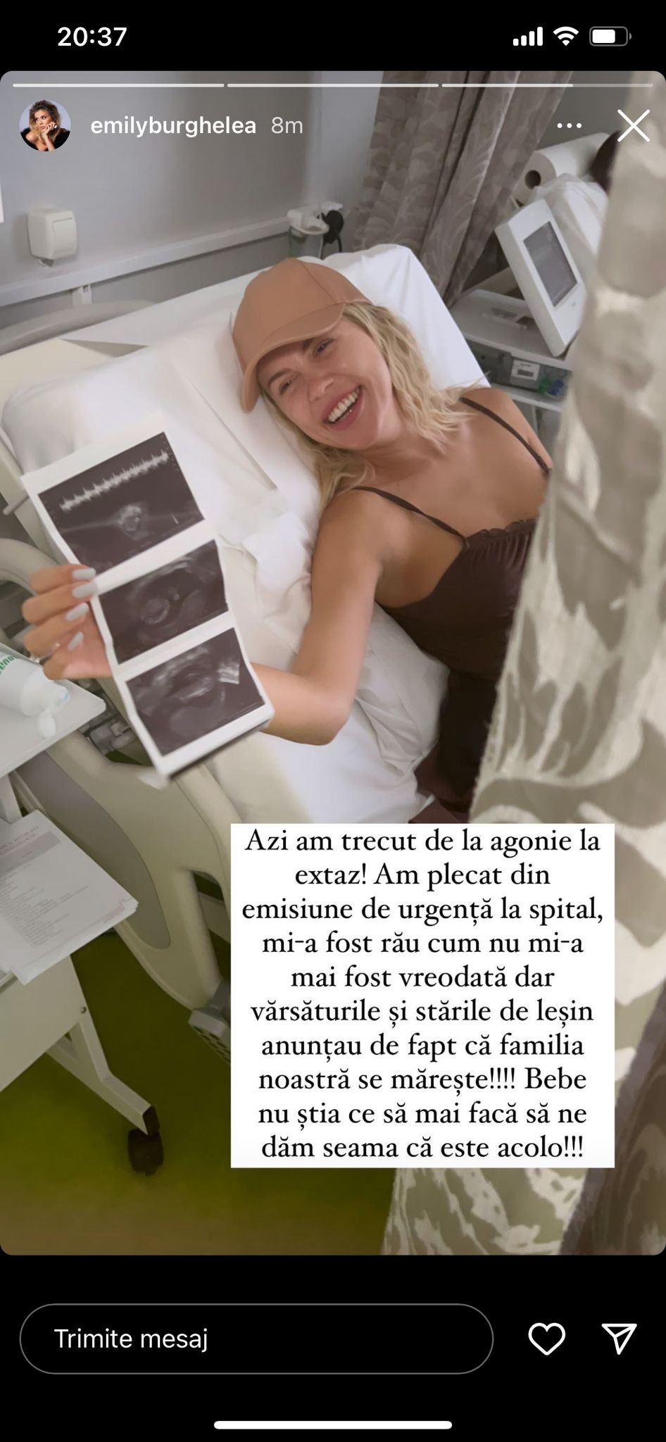 „Azi am trecut de la agonie la extaz! Am plecat din emisiune de urgență la spital. Mi-a fost rău cum nu mi-a fost vreodată, dar vărsăturile și stările de leșin anunțat, de fapt, că familia noastră se mărește! Bebe nu știa ce să mai facă să ne dăm seama că este acolo”, a scris Emily Burghelea la InstaStory.