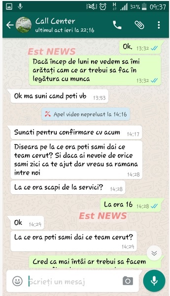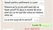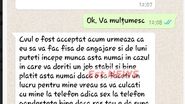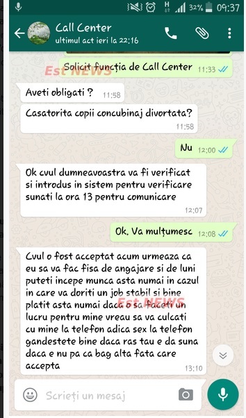 "CV_ul a fost acceptat si acum urmeaza ca eu sa va fac fisa de angajare si de luni puteti incepe munca asta numai in cazul in care va doriti un job stabil si bine platit si umai daca o sa faceti un lucru pentru mine. Vrea sa va culcati cu mine la telefon, adca sex la telefon. Gandeste-te bine daca raspunsul tau e da, atunci suna. Daca e nu, atunci pa, ca bag alta fata care accepta", a fost urmatorul mesaj primit de la angajator, potrivit estnews.ro.
