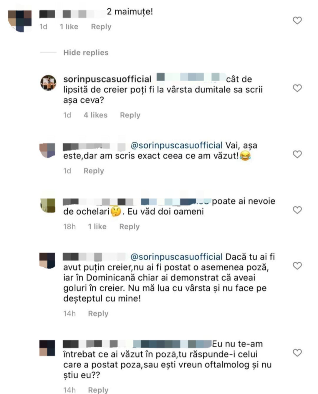 Această persoană mi-a dat și foarte multe mesaje în privat de când am ieșit din emisiune, erau niște mesaje oribile. Acest hate pe care eu mi-l iau- și mulți de pe acest internet- este pentru că oamenii sunt foarte frustrați, sunt invidioși, supărați că ei nu reușesc nimic în viață. Eu nu sunt supărat pe ei, nu îmi doresc nimic din ceea ce au ei. Dar să fii rasist este foarte urât! Eu înțeleg că sunt persoane încă cu sufletul în pământ de oftică, dar vedeți-vă de treaba voastră!", a transmis Sorin Pușcașu, pe contul lui de Instagram.