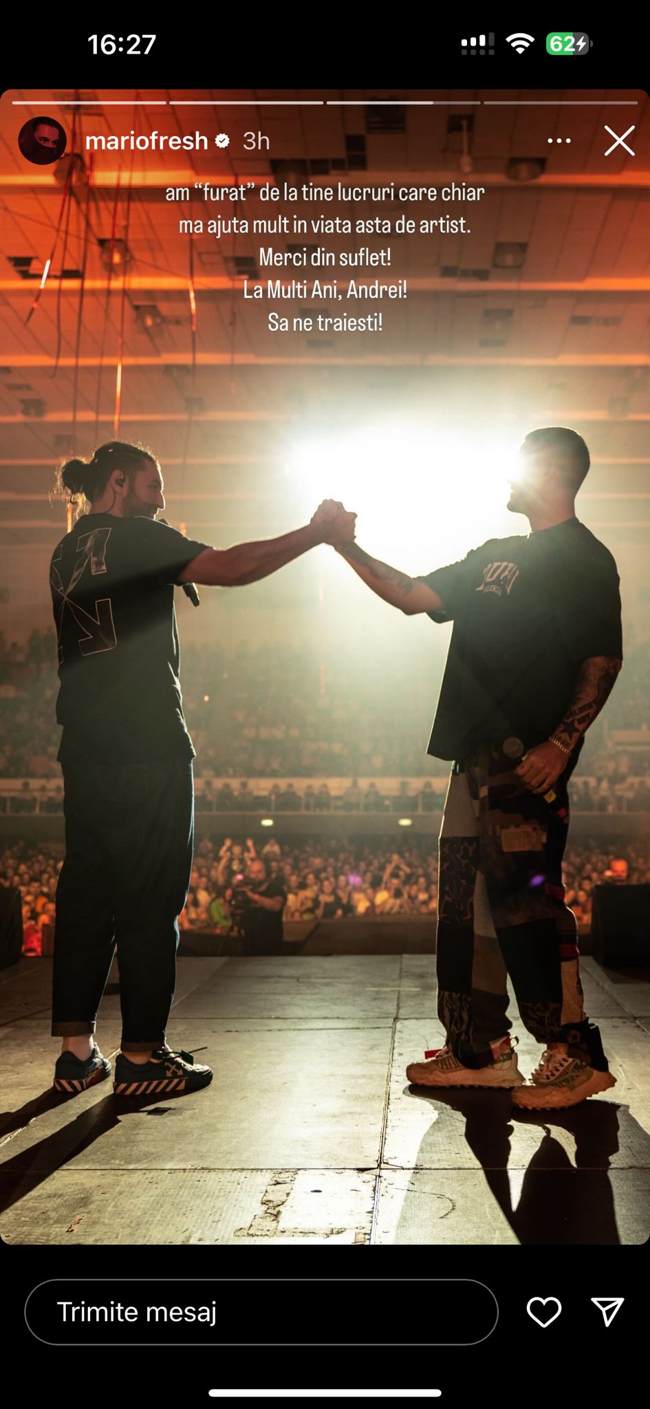 Același lucru a făcut și Mario Fresh, care pe lângă urarea clasică de ”La mulți ani”, acesta a ținut și să-i mulțumească pentru lucrurile pe care le-a învățat de la el, lucruri care l-au ajutat enorm în viața de artist.