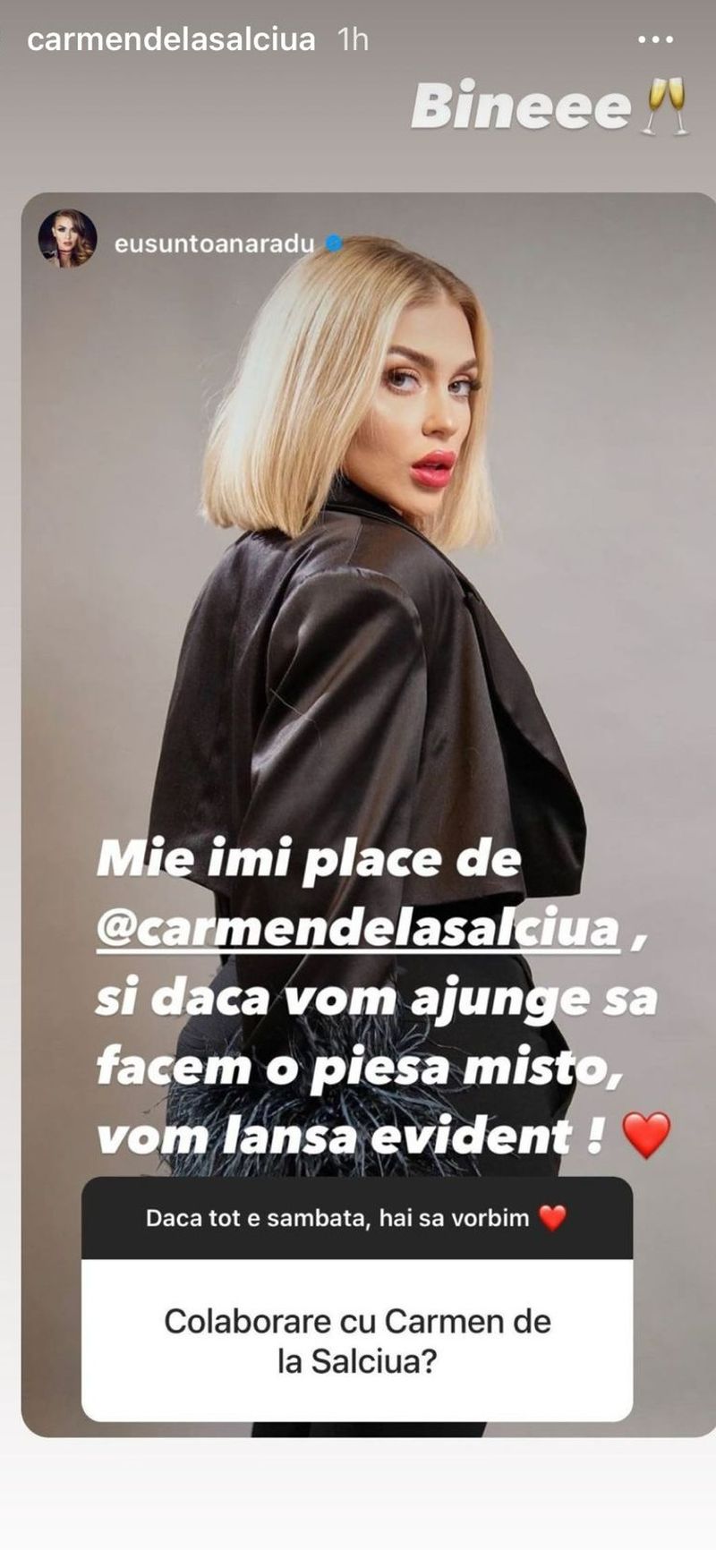 „Mie îmi place de Carmen de la Sălciua și dacă vom ajunge să facem o piesă mișto o vom lansa, evident!”, a scris Oana Radu pe rețelele de socializare.
