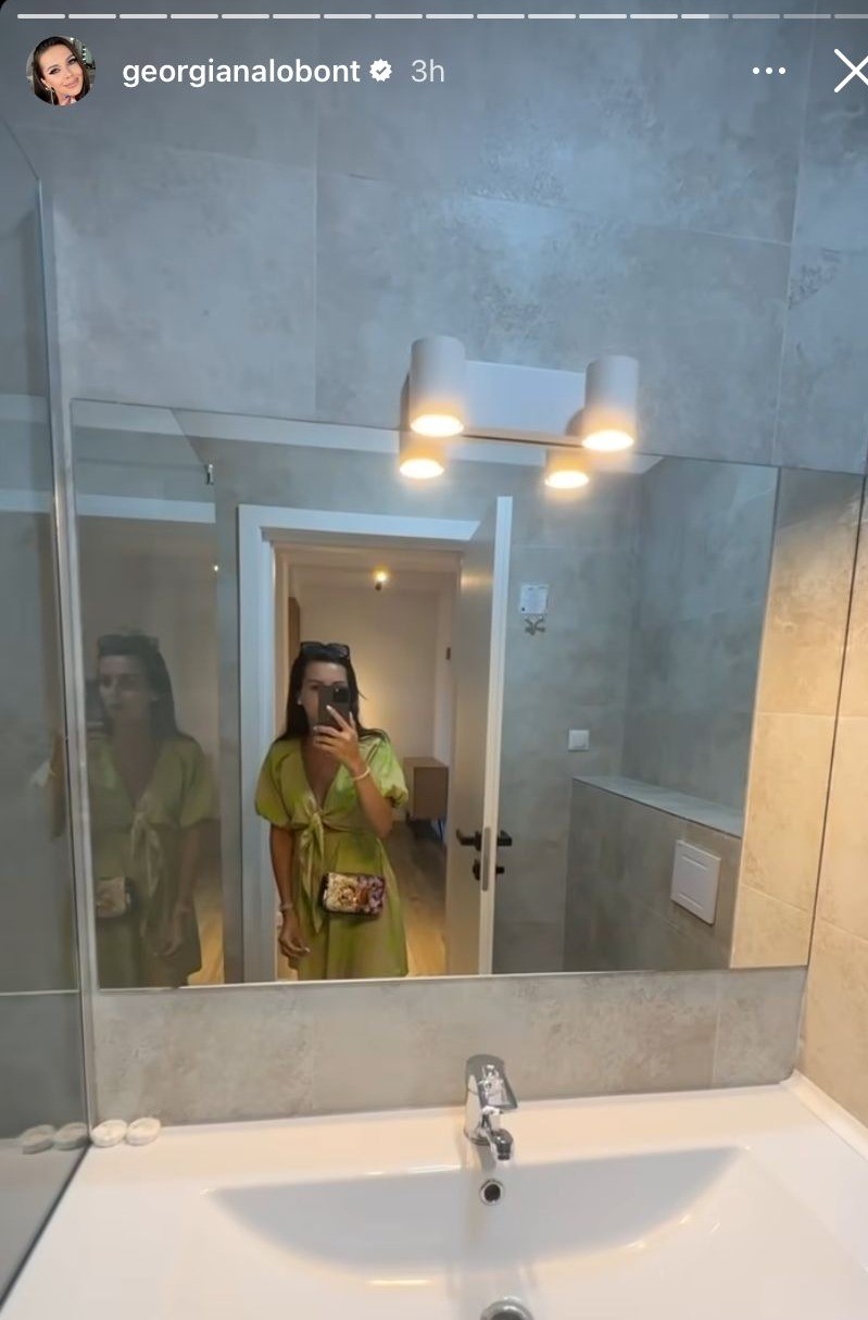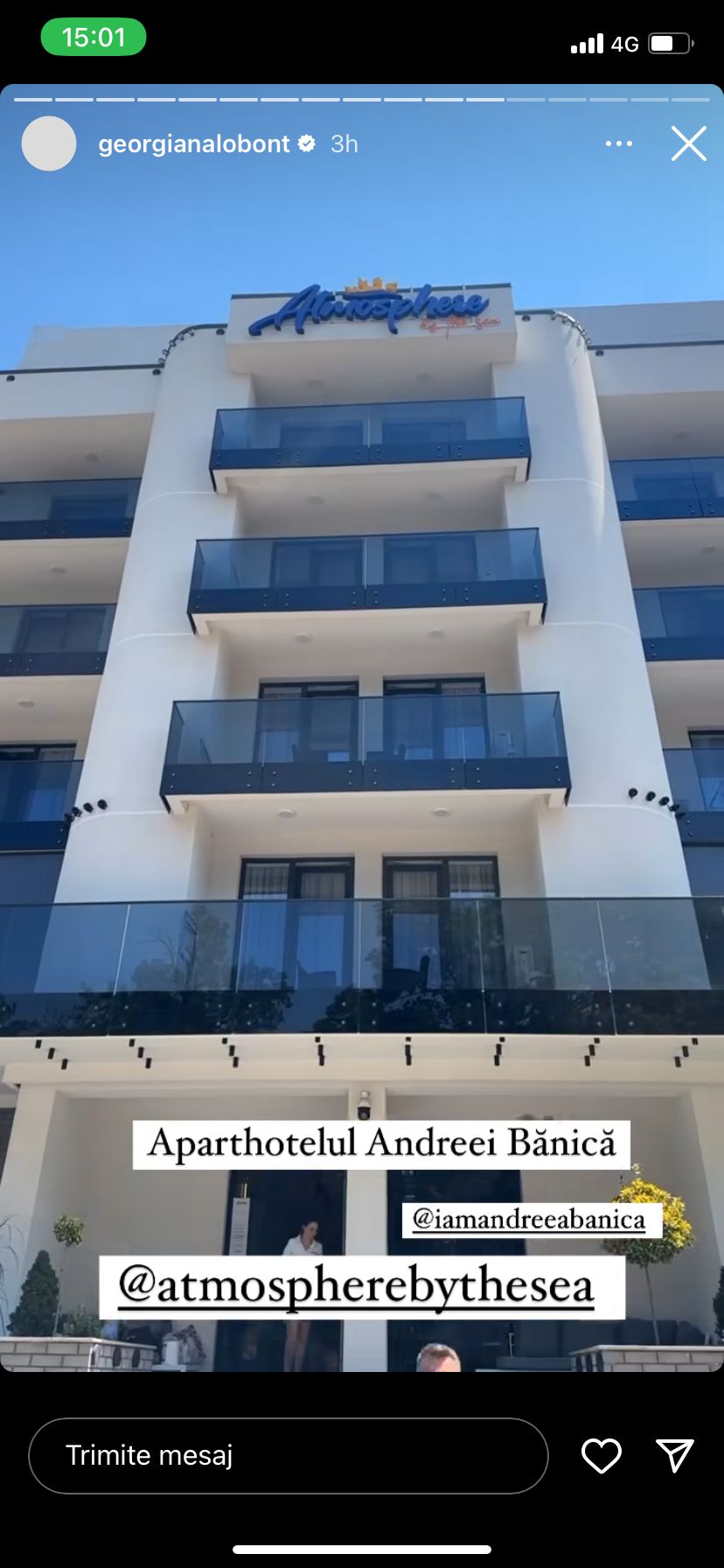 „Dragilor, am ajuns la un super hotel în Eforie Nord, la cel mai frumos hotel, al Andreei Bănică. Trebuie să coboare să ne întâlnim. Este o fată extraordinară și are o familie extraordinară și, iată, prin munca ei și a soțului ei ce au reușit ei doi să facă. Noi suntem impresionați de acest hotel. Este extraordinar. Bravo, Andreea Bănică! Bravo ție și soțului tău. Și acum să așteptăm să vină, să mergem să mâncăm împreună. Uite cine vine! Patroana patroanelor! Bine te-am găsit!”, a spus Georgiana Lobonț în mediul online.
