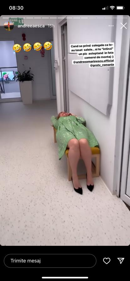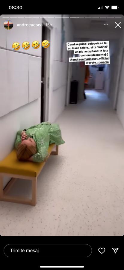 „Când se prind colegele că te-au lăsat șalele...și te întinzi un pic așteptând în fața camerei de montaj.”, a scris Andreea Esca în dreptul video-ului cu pricina.