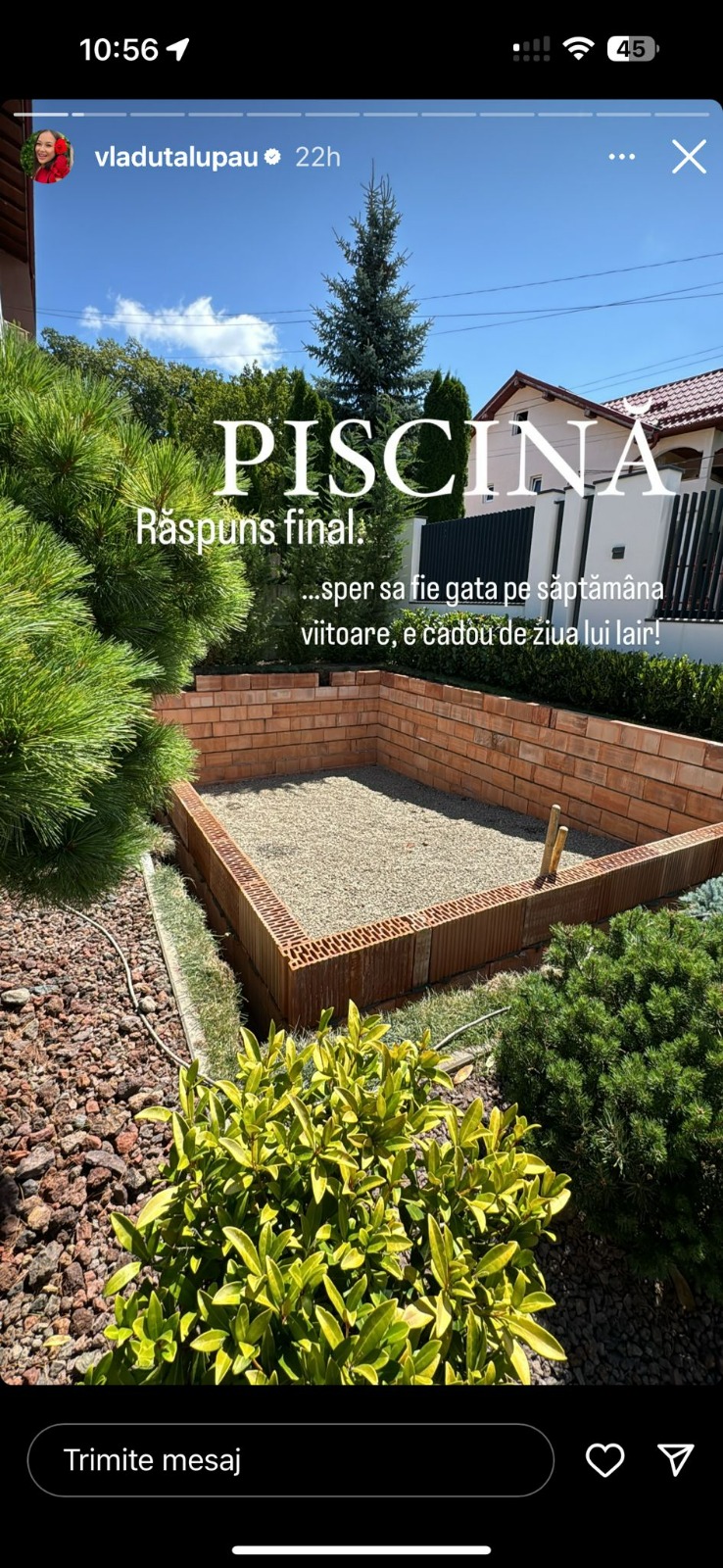 „Piscină. Răspuns final… Sper să fie gata, e cadou de ziua lui Iair!”, a scris Vlăduța Lupău, pe pagina personală de Instagram.