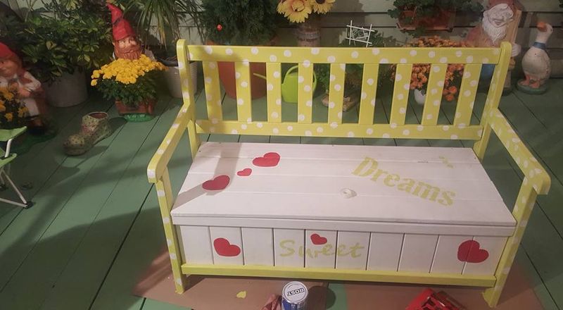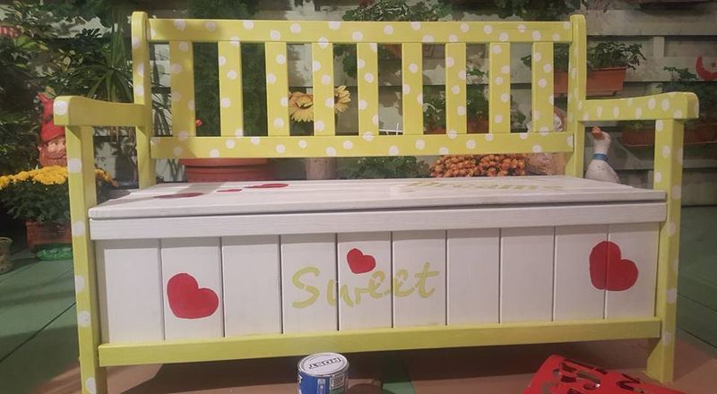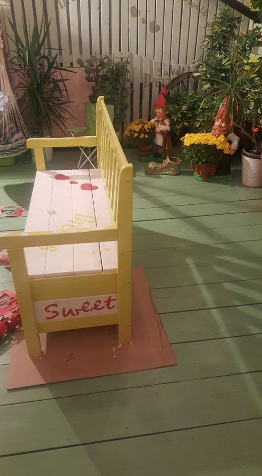 Gratiela, sotia lui Andrei Duban, si-a pictat banca din curte in nuante colorate.