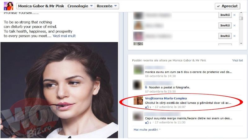 Postarea vrajitoarei Maria Campina continua sa troneze pe pagina MonicaiPostarea vrajitoarei Maria Campina continua sa troneze pe pagina MonicaiCulmea este ca, desi anuntul ghicitoarei a fost urcat de cateva zile bune, fosta doamna Columbeanu nu l-a sters, acesta continuand sa fie vazut de cele 60.246 de persoane care apreciaza pagina Monica Gabor & Mr Pink. Intre timp, in calitate de administrator al acestei pagini, Moni a avut grija sa incarce pe contul sau inca doua postari proprii, dar a omis sa stearga mesajul vrajitoarei, acesta putand fi vazut in tara, peste Ocean, dar si in Dubai unde locuieste sora sa, Ramona.