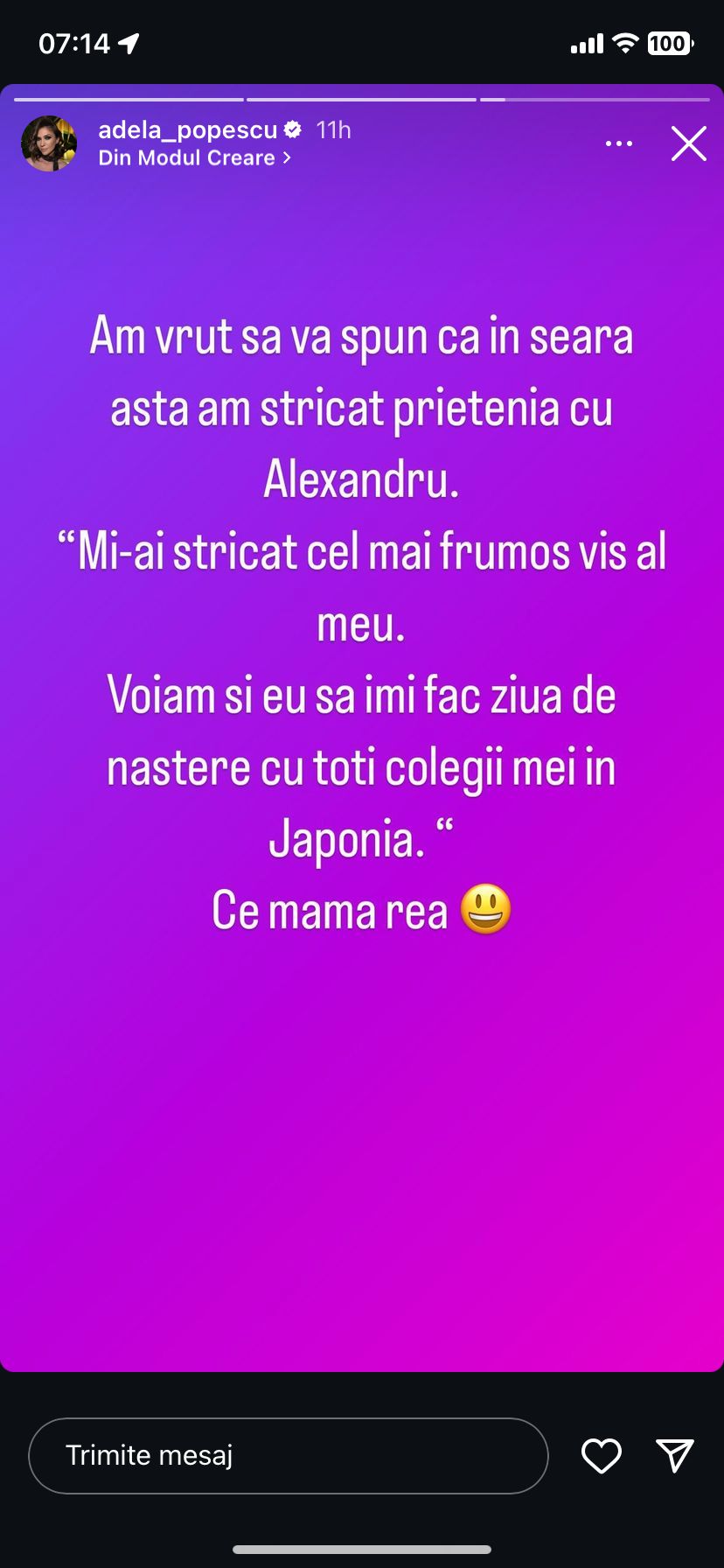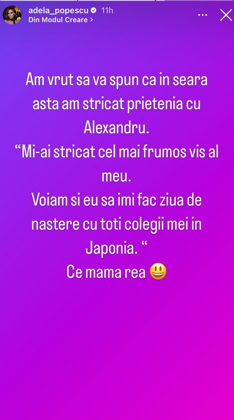 „Am vrut să vă spun că în seara asta am stricat prietenia cu Alexandru. «Mi-ai stricat cel mai frumos vis al meu. Voiam și eu să îmi fac ziua de naștere cu toți colegii mei în Japonia.» Ce mamă rea.”, a scris, amuzată, Adela Popescu în mediul online.