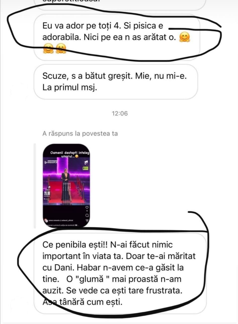 ”Ce penibilă ești! N-ai făcut nimic important în viața ta. Doar te-ai măritat cu Dani. Habar n-avem ce a găsit la tine. O ”glumă” mai proastă nu am auzit. Se vede că ești tare frustrată. Așa tânără cum ești”, este mesajul pe care Gabriela Prisăcariu l-a primit de la o doamnă care cândva o aprecia.