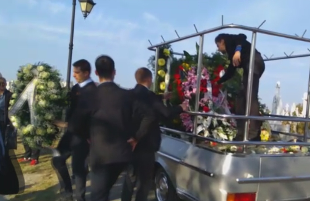 Pe mormântul ”Prinţului din Bănie”, pe iarbă, sprijinind alte cruci. Şi tot mai veneau. Camioane întregi de flori. Timp de 15 minute, angajaţii unei firme de pompe funebre au descărcat coroane.