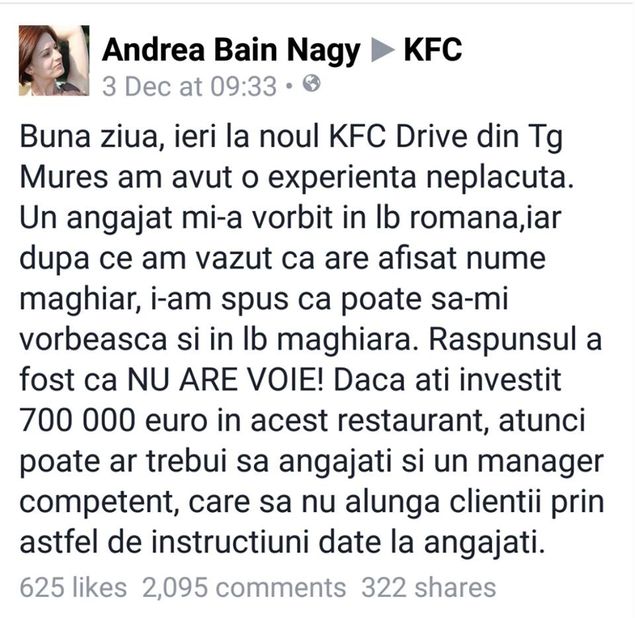 Tanara de etnie maghiara a mers la drive in la KFC pentru a-si lua ceva si a fost oripilata de faptul ca angajatul de acolo i-a vorbit in limba romana. Se pare ca in conceptia ei, gestul lui este cu atat mai revoltataor cu cat era si el etnic maghiar si a vorbit in romana pentru ca managerul restaurantului ii impusese asta.