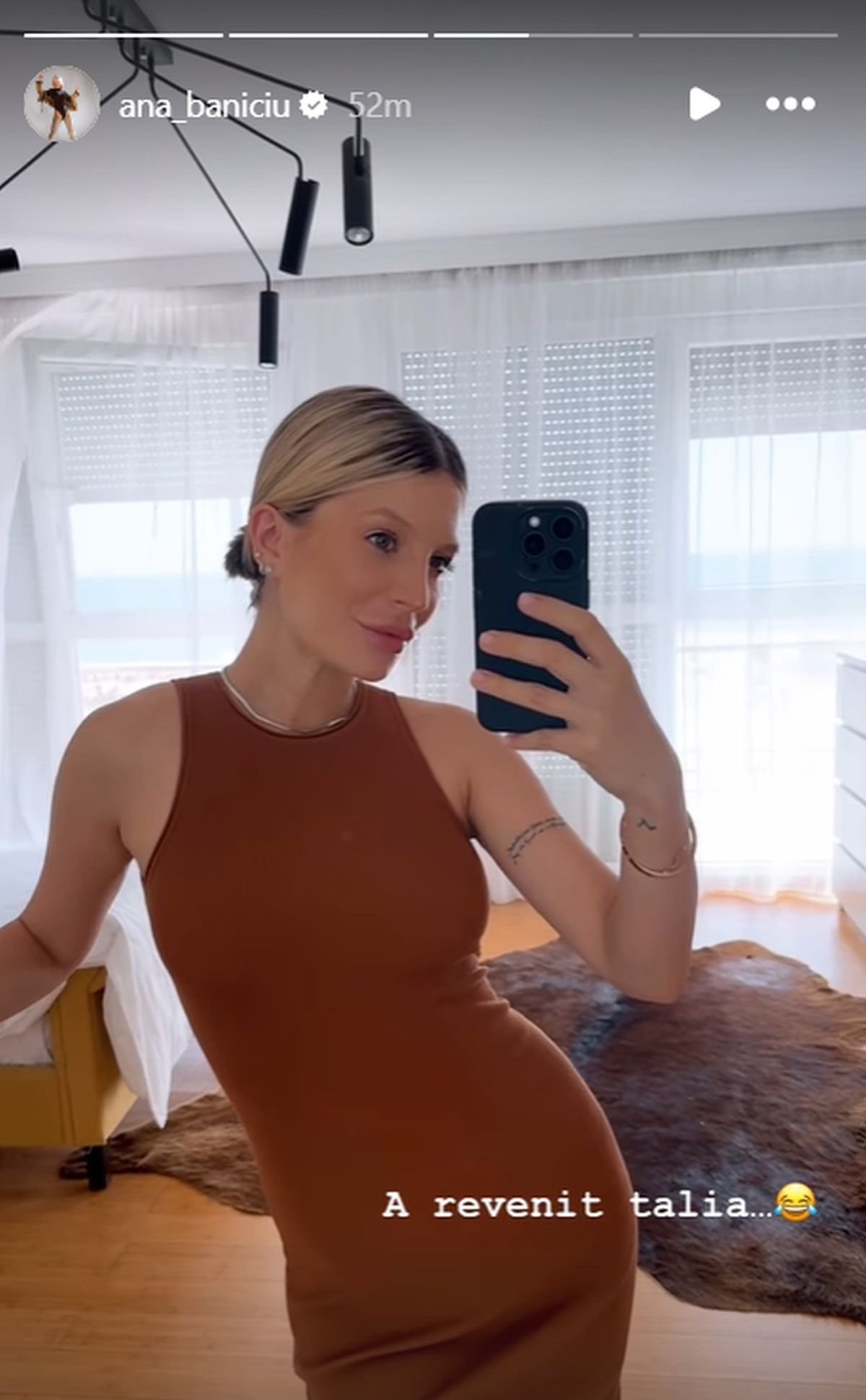 "A revenit și talia...", a scris Ana Banciu în cel mai recent story și le-a arătat internauților o scurtă filmare cu ea în oglindă.