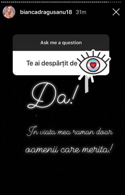 „Te-ai despărțit de ...?”, a fost Bianca întrebată. „Da! În viața mea rămân doar oamenii care merită”, a răspuns ea, semn că nu a rămas prietenă cu fostul, așa cum declara cu câteva zile în urmă.