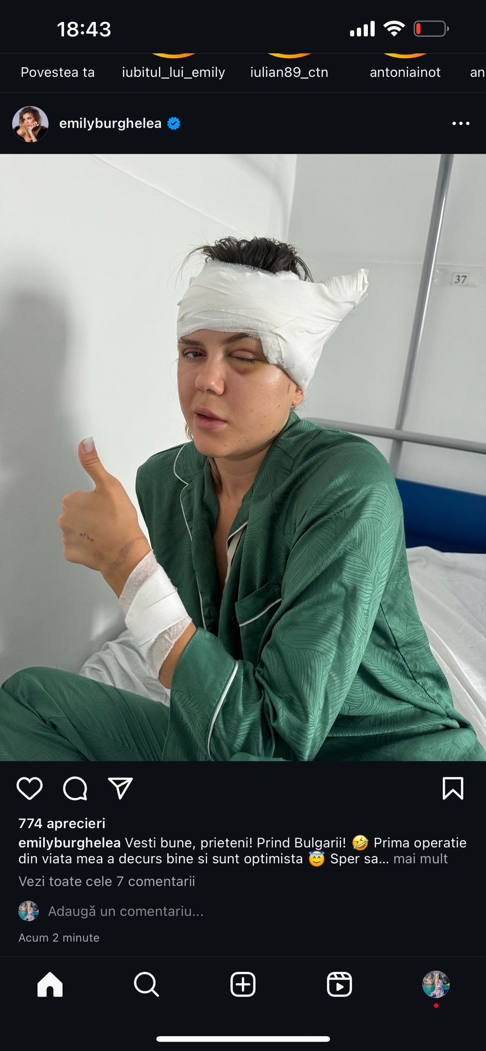 „Vești bune, prieteni! Prind Bulgarii! Prima operație din viața mea a decurs bine și sunt optimistă. Sper să mă obișnuiesc repede cu noua mea prietenă, tija, vom petrece împreună o bună perioadă de vreme, cred că la noapte va fi mai dificil însă ce-a fost mai greu a trecut. Sunt bine. Vă mulțumesc pentru gândurile bune. Mă ajută foarte mult energia pozitivă pe care mi-o transmiteți, o simt și mă vindecă!”, a scris Emily Burghelea, pe pagina personală de Instagram.