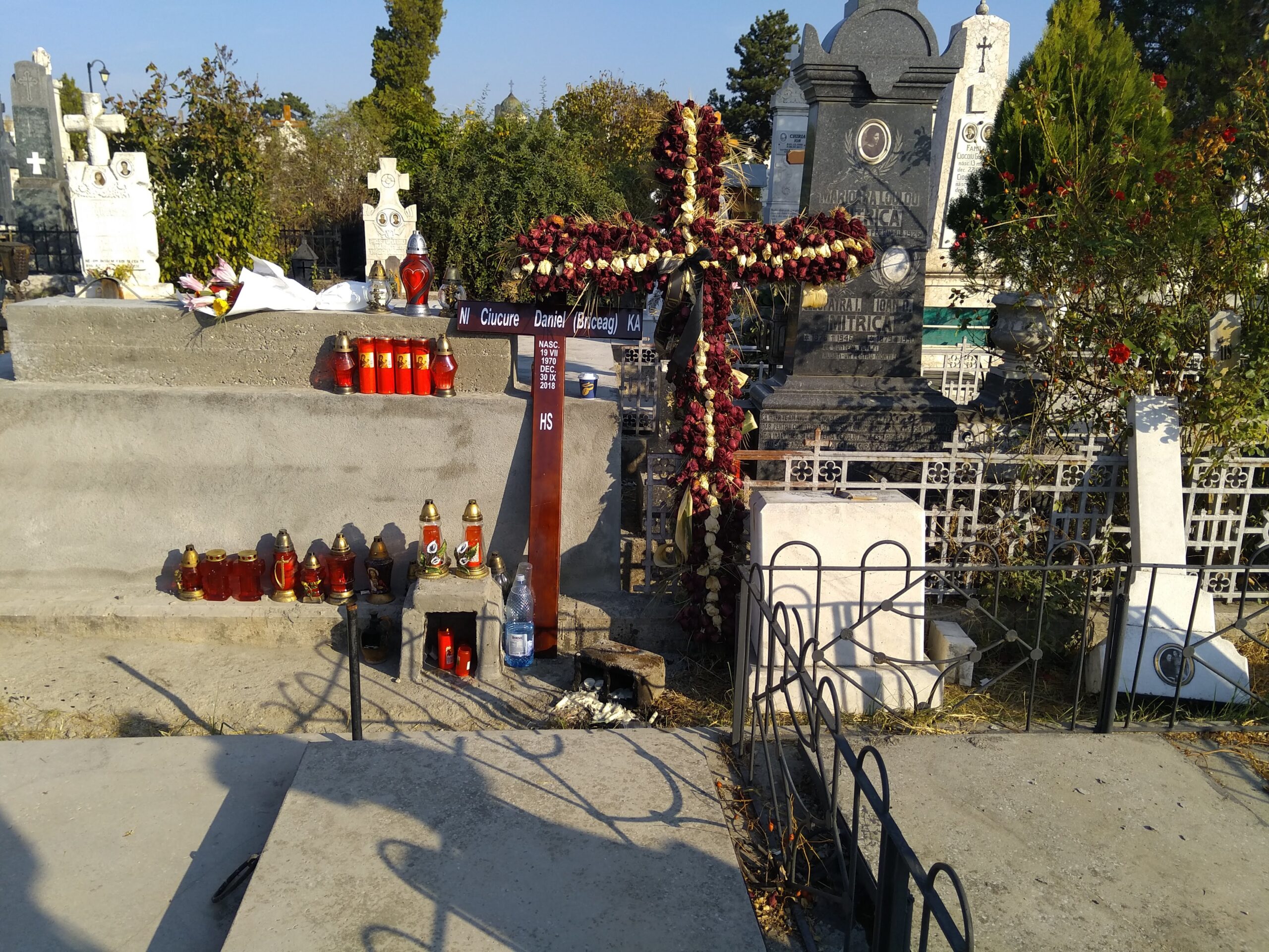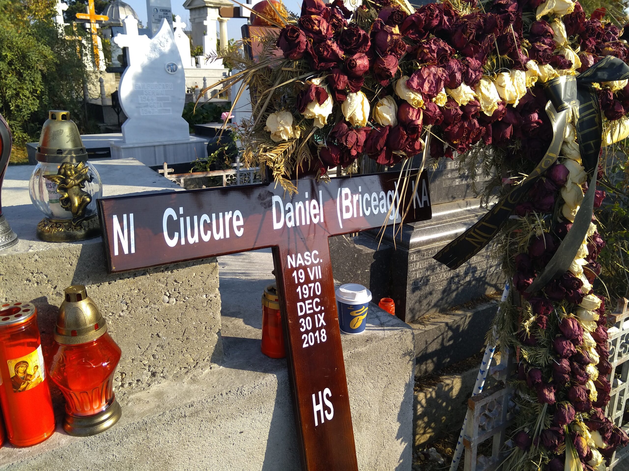 Craioveanul care a devenit celebru în toată ţara transmiţându-şi propria moarte pe Facebook este inmormantat pe aleea principală a Cimitirului Sineasca, la câţiva paşi de locul de veci al fostei glorii a fotbalului, Ilie Balaci. Rudele lui Daniel Radu i-au scris pe cruce numele de familie din buletin, Ciucure, dar şi porecla – Briceag – în paranteză.