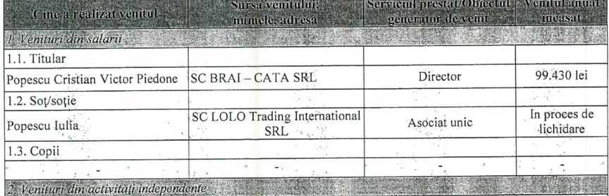 Cristian Popescu Piedone a fost director la Brai-Cata SRL, conform declarației de avere pe care a depus-o anul trecut, atunci când s-a înscris în cursa electorală pentru sectorul 5. În decursul unui an, el și-a asigurat din partea companiei un venit de 99.430 lei (aproximativ 8.200 de lei pe lună), aceasta fiind și singura sursă de venit pe care Piedone a avut-o în această perioadă.