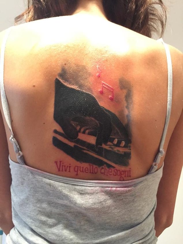 Acesta este tatuajul de pe spatele Nidiei MoculescuPe langa aceste elemente, pe spatele Nidiei au mai fost tatuate niste note muzicale, dar si un mesaj in limba italiana, „Vivi quello che sogni”, care in traducere ar suna „Traieste ceea ce visezi”.