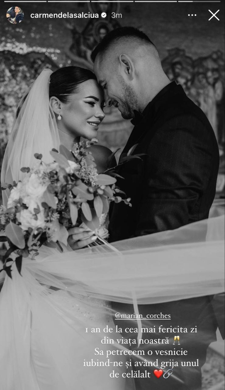 „1 an de la cea mai fericită zi din viața noastră! Să petrecem o veșnicie iubindu-ne și având grijă unul de celălalt”, a fost mesajul pe care Carmen de la Sălciua l-a scris în mediul online.