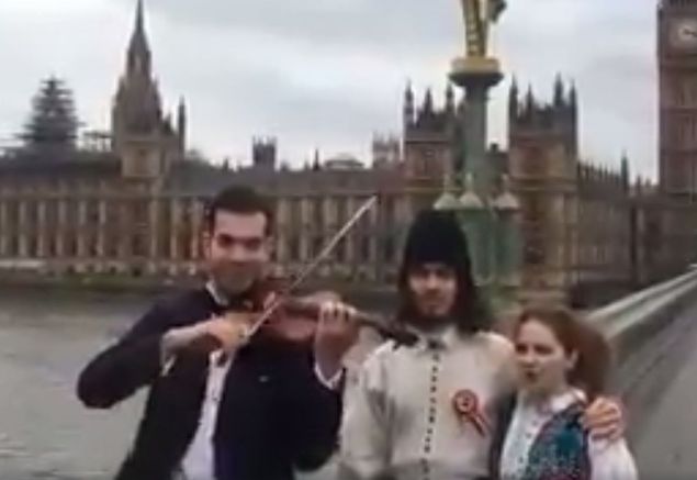 Imnul Romaniei a fost cantat anul trecut, de 1 decembrie, pe Westminster Bridge, de catre trei artisti romani, care au infruntat un frig patrunzator! Cei trei compatrioti care au realizat acest moment emotionant sunt Bogdan Alexandru Costache, violonist roman, nascut in 1992, la Craiova, premiat in peste 30 de competitii nationale si internationale, Andrada Maria Brisc, pianista si solista vocala, nascuta la Oradea, care a absolvit mai intai cursurile Facultatii de Muzica din Oradea, apoi, in 2011, s-a licentiat ca pianista si la The Royal Academy of Music, Londra, si Florin Constantin Pascu, care a urmat cursurile Facultatii de Muzica din Oradea, dupa care s-a mutat la Londra si a studiat la Tech Music Schools.