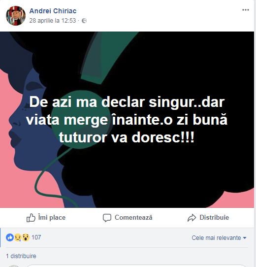 “De azi ma declar singur… dar viata merge inainte. O zi buna tuturor va doresc!!!”, e mesajul postat de Chiriac, anuntand astfel ca s-a despartit de sotia cu care avea si copii.