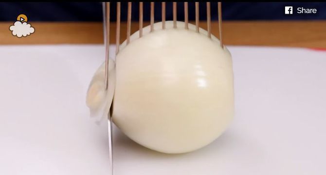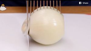 Exista insa un truc simplu care iti va schimba viata. Ai nevoie de un pieptene cu dinti lungi de metal pe care sa-l infigi in ceapa. Tot ce trebuie sa faci apoi este sa introduci cutitul printre dinti si sa tai.