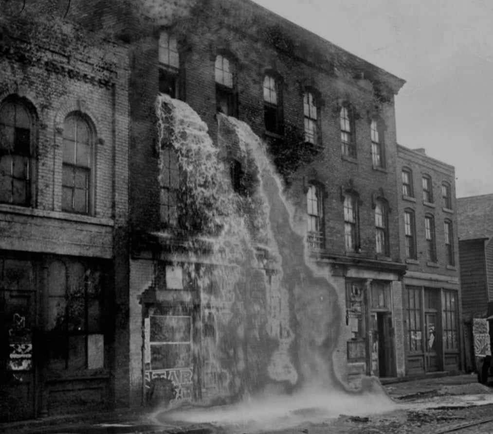 Această imagine prezintă momentul în care o cantitate uriașă de alcool este aruncată de la fereastra unei clădiri, după ce polițiștii au descoperit băutura la o distilerie care funcționa ilegal