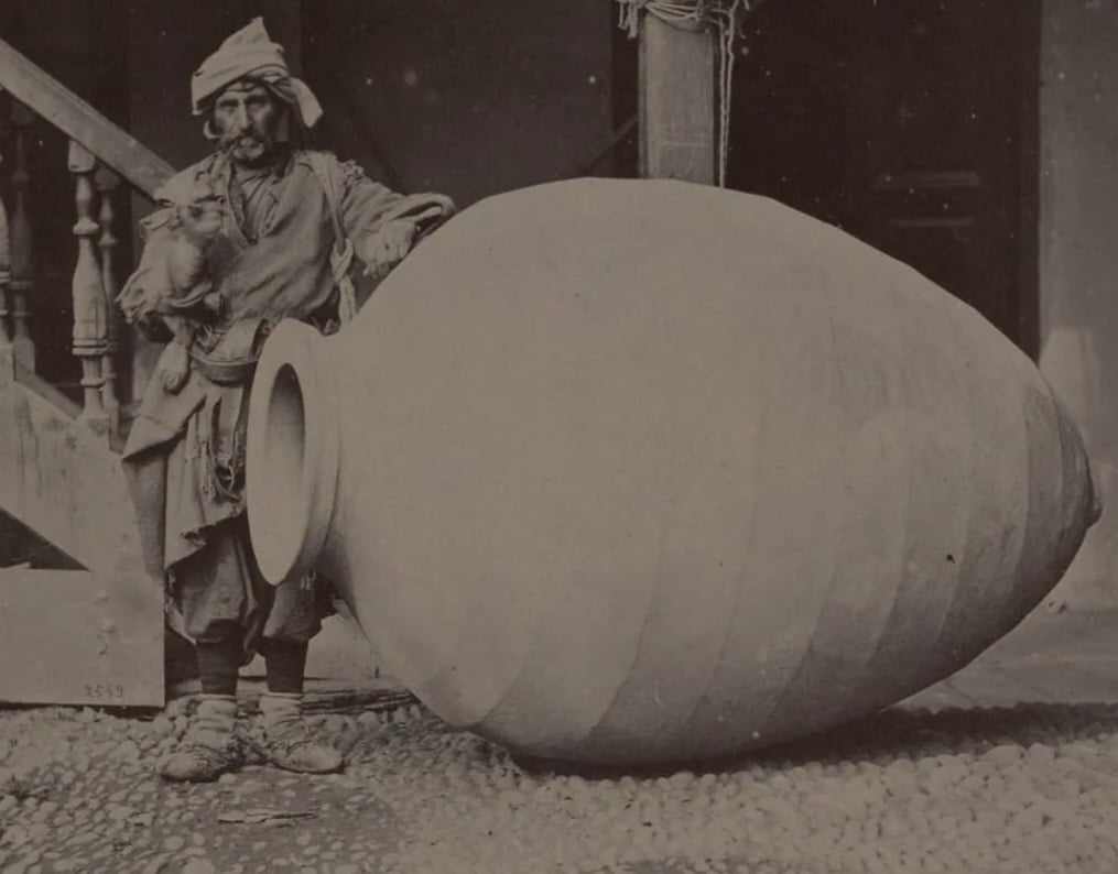 Imaginea ciudată prezintă un bărbat care stă sprijinit de un vas uriaș din lut, ce era folosit pentru păstrarea vinului în Georgia.