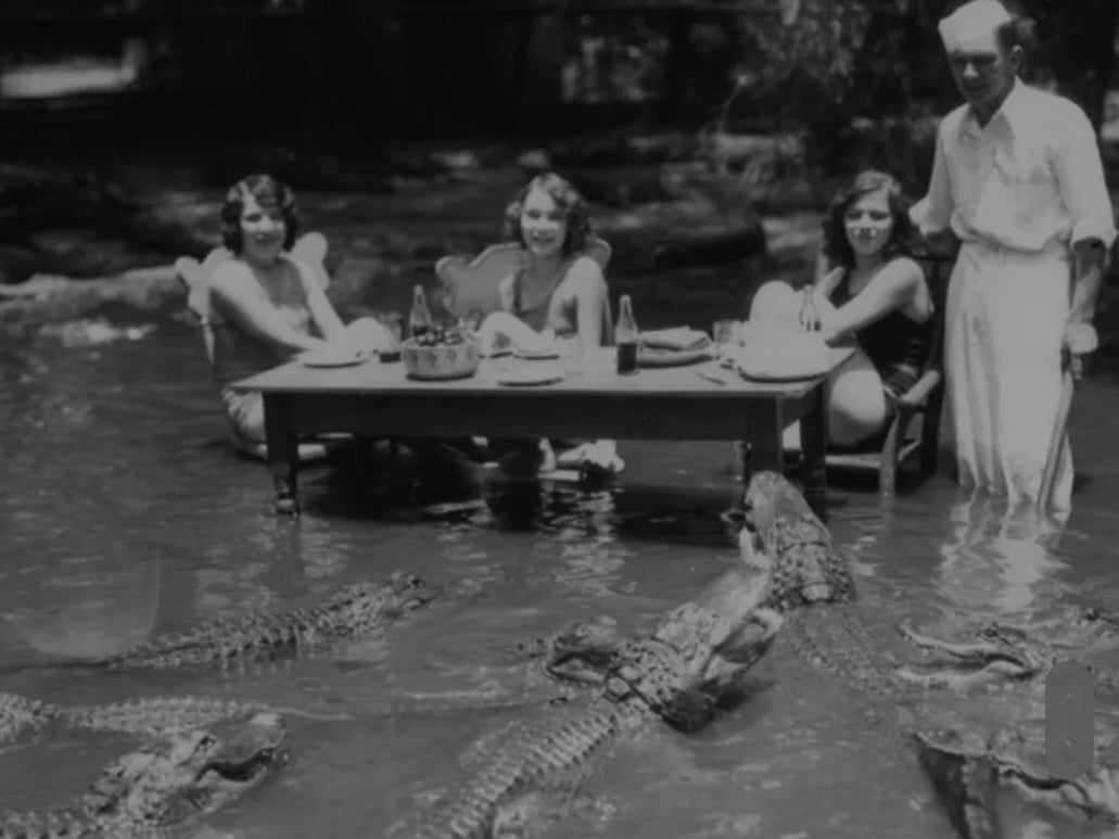 Fără doar și poate, fotografia aceasta este una dintre cele mai ciudate și neobișnuite din toate timpurile. Ilustrația prezintă trei doamne care servesc masa într-un lac plin de crocodili. Alături de ele se poate observa cu ușurință că se află și un dresor care supraveghează cu atenție specia de reptile uriașe.