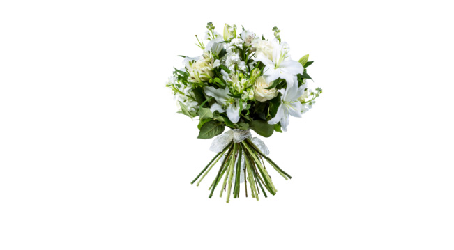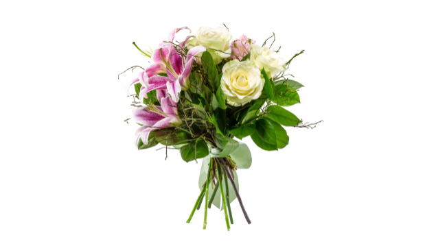 Un alt Buchet Trandafiri Cu Crin Roz va poate incanta privirea, de data aceasta un buchet cu trandafiri albi. Acesta se potriveste perfect pentru o aniversare sau pentru o zi de nastere. Este un buchet discret, un buchet care iese in evidenta prin naturalete.