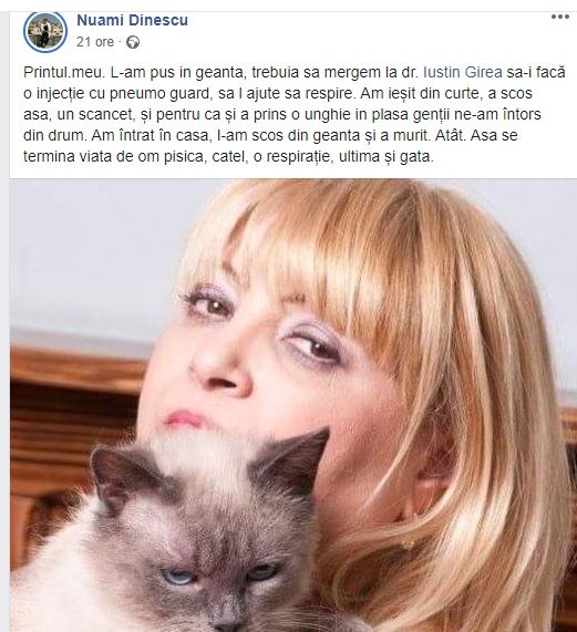 Ea a postat o fotografie cu o pisică și a explicat: “Printul.meu. L-am pus in geanta, trebuia sa mergem la dr. Iustin Girea sa-i facă o injecție cu pneumo guard, sa l ajute sa respire. Am ieșit din curte, a scos asa, un scancet, și pentru ca și a prins o unghie in plasa genții ne-am întors din drum. Am întrat în casa, l-am scos din geanta și a murit. Atât. Asa se termina viata de om pisica, catel, o respirație, ultima și gata.”