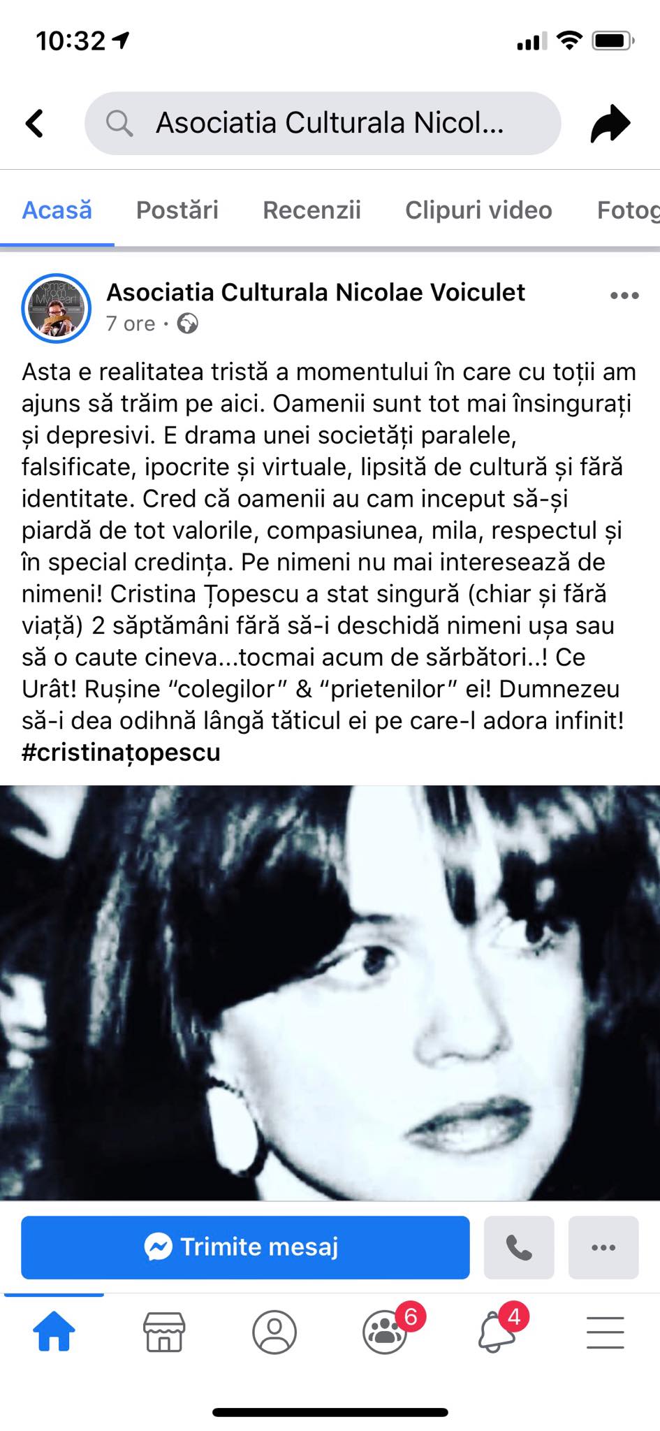 „Asta e realitatea tristă a momentului în care cu toții am ajuns să trăim pe aici. Oamenii sunt tot mai însingurați și depresivi. E drama unei societăți paralele, falsificate, ipocrite și virtuale, lipsită de cultură și fără identitate. Cred că oamenii au cam inceput să-și piardă de tot valorile, compasiunea, mila, respectul și în special credința. Pe nimeni nu mai interesează de nimeni! Cristina Țopescu a stat singură (chiar și fără viață) 2 săptămâni fără să-i deschidă nimeni ușa sau să o caute cineva…tocmai acum de sărbători..! Ce Urât! Rușine “colegilor” & “prietenilor” ei! Dumnezeu să-i dea odihnă lângă tăticul ei pe care-l adora infinit! #cristinaţopescu”, este mesajul postat de Nicolae Voiculeț.