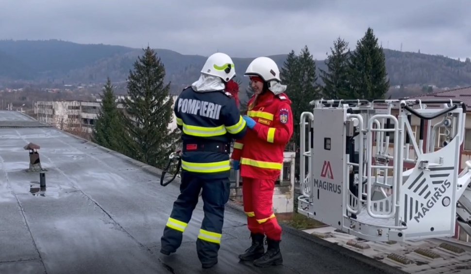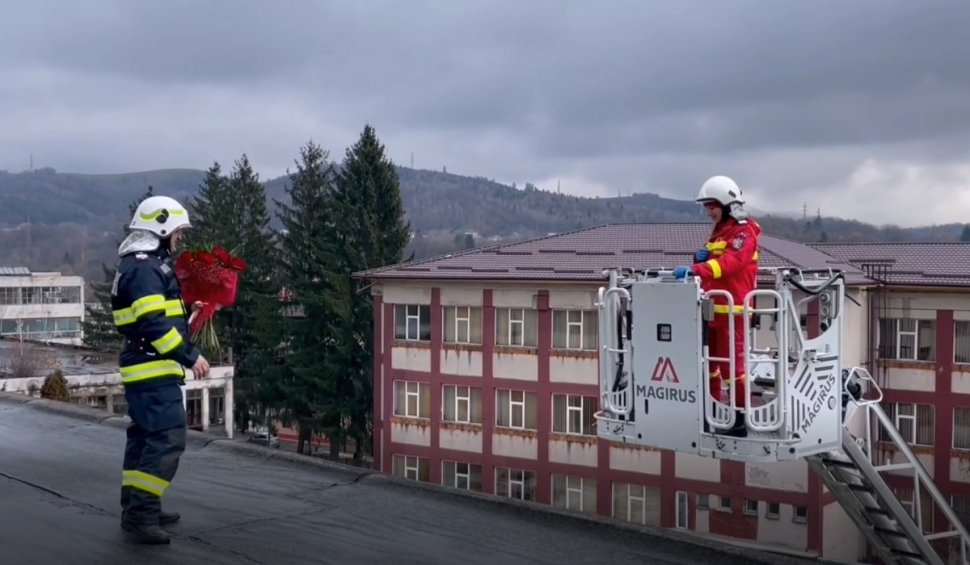 Cerere inedită în căsătorie în Argeș! Un pompier și-a cerut colega de soție în timpul unui exercițiu, la 10 metri înălțime