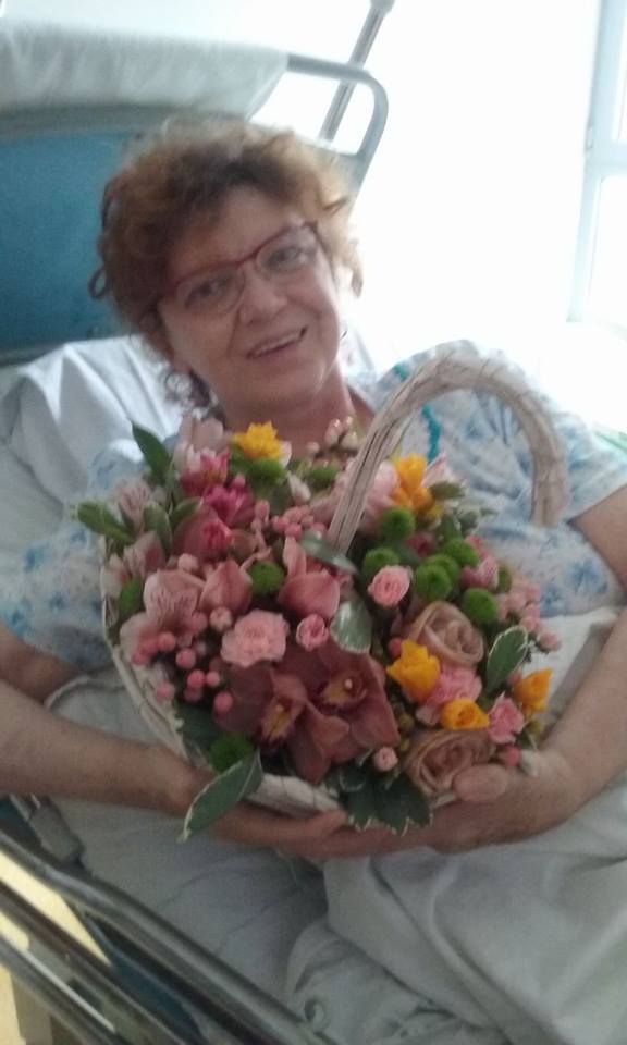 Cezara Dafinescu apare pe patul de spital, cu un mare buchet de flori.