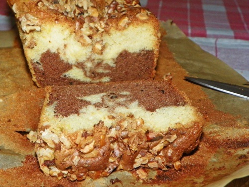 Sau puteti topi o ciocolata mare, neagra, cu putin unt, ca sa nu se lipeasca, apoi puneti usor cu lingurita in aluatul de chec.