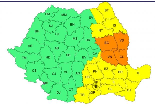 Avertizarea intră în vigoare pe 24 mai, ora 15, și rămâne varabilă până pe 25 mai, ora 10. Vizează județele Vrancea, Galați, Vaslui și Bacău, acolo unde instabilitatea atmosferică va fi accentuată iar aversele importante cantitativ. Vor apărea descărcări electrice, vijelii, rafale de vânt de 50-70 km/h și grindină. Cantitățile de apă vor fi de 30-40 l/mp și izolat de peste 50 l/mp.